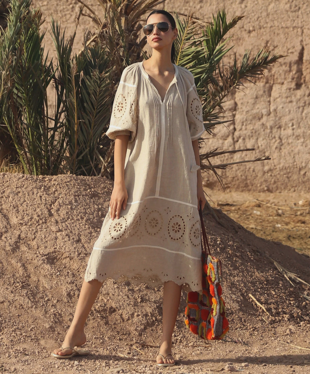 Embroidered cutwork and fine pleat detailing embellish the relaxed silhouette of the Magnolia dress. Cut from natural linen blend, the styling seams are traced with artisanal tape work, while tasselled ties finish the look—we like to leave them undone to enhance its easy, laid-back feel. Elasticated blouson three-quarter sleeves and concealed side-seam pockets add practicality to its effortless charm. Pair with natural leather sandals for a touch of artisan elegance from dawn to dusk.