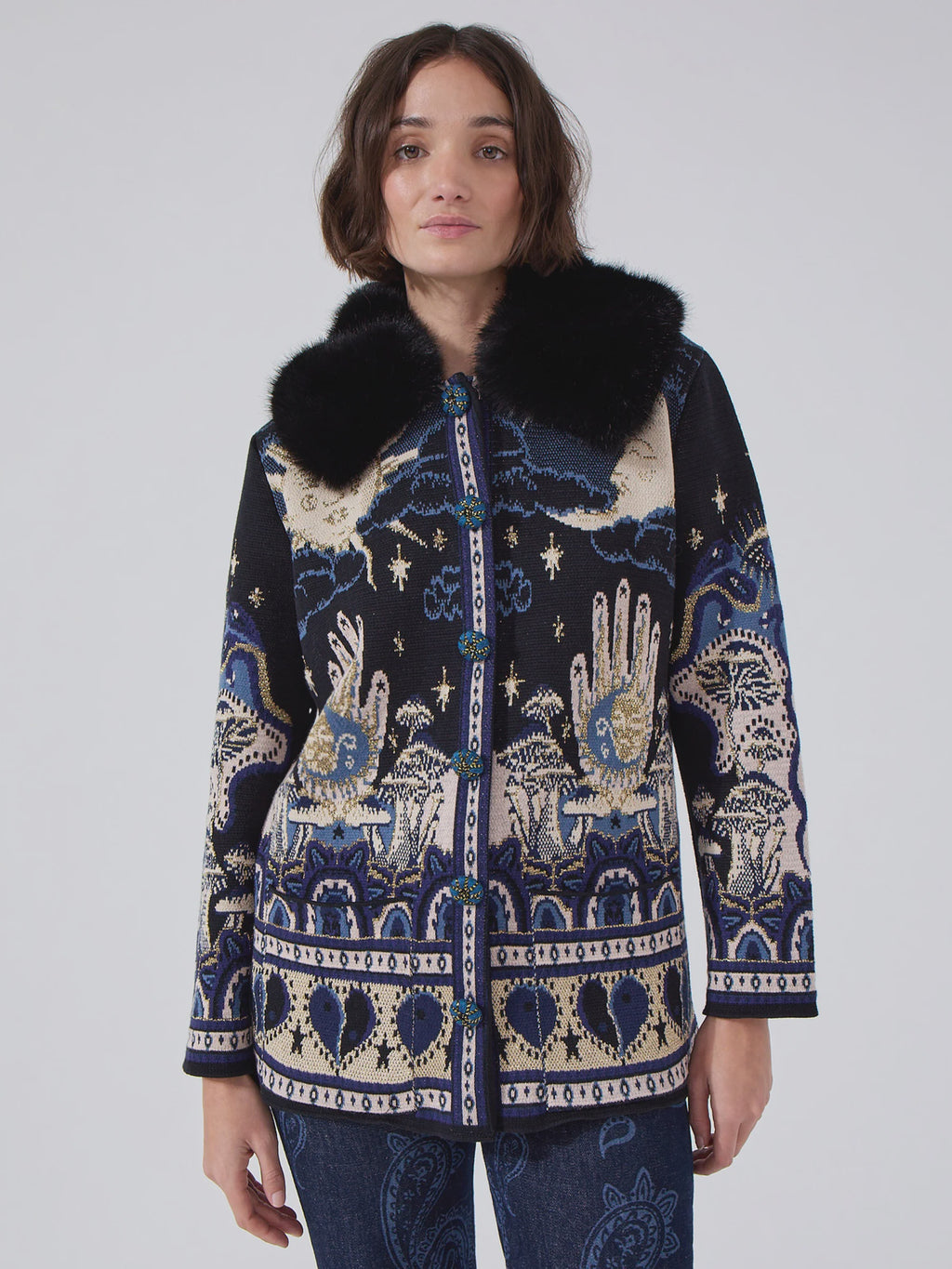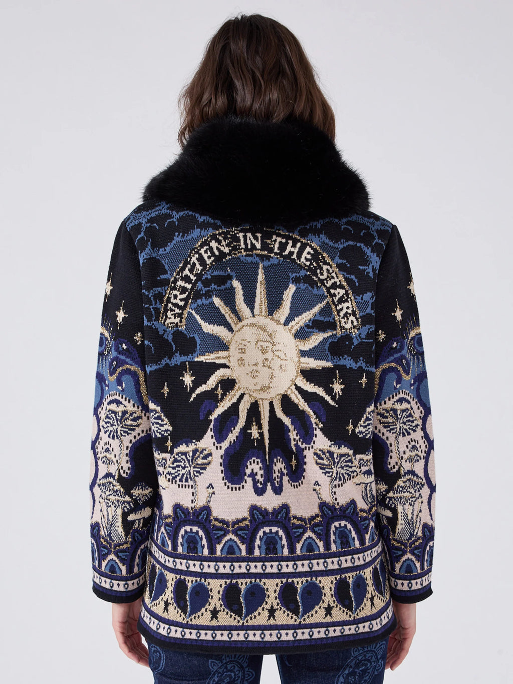 nspired by travel and the magic of the unknown, this black celestial print knitted jacket is the ultimate high-impact layer. Crafted with a plush faux shearling collar and finished with our Written in the Stars print, its magical motifs - from eyes and hands to stars and florals - look great with a t-shirt and jeans.