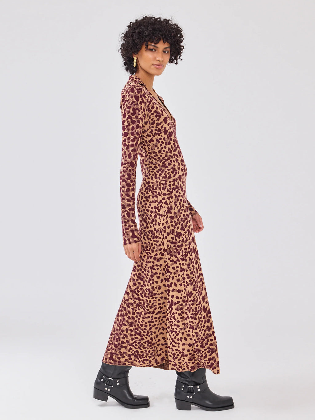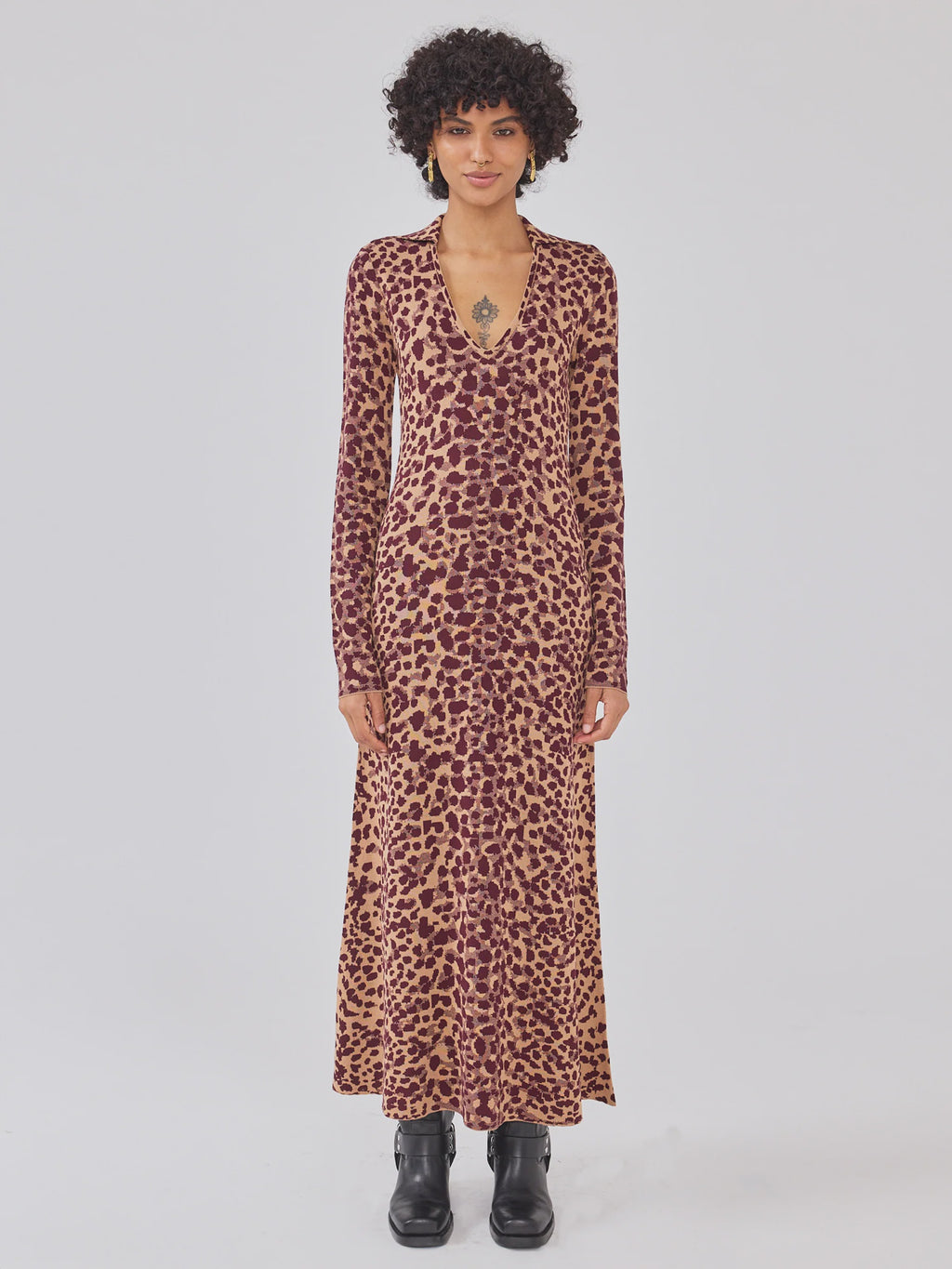 A little bit wild, a whole lot wearable - this animal print midi dress takes leopard print to a bold new level. Crafted from a silk-viscose blend for a soft, slinky feel, the open collar and easy silhouette makes this a knitted dress that works both day and night - just switch the boots for heels.