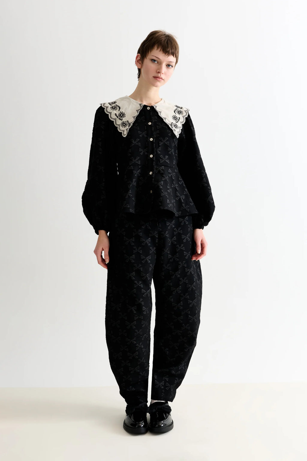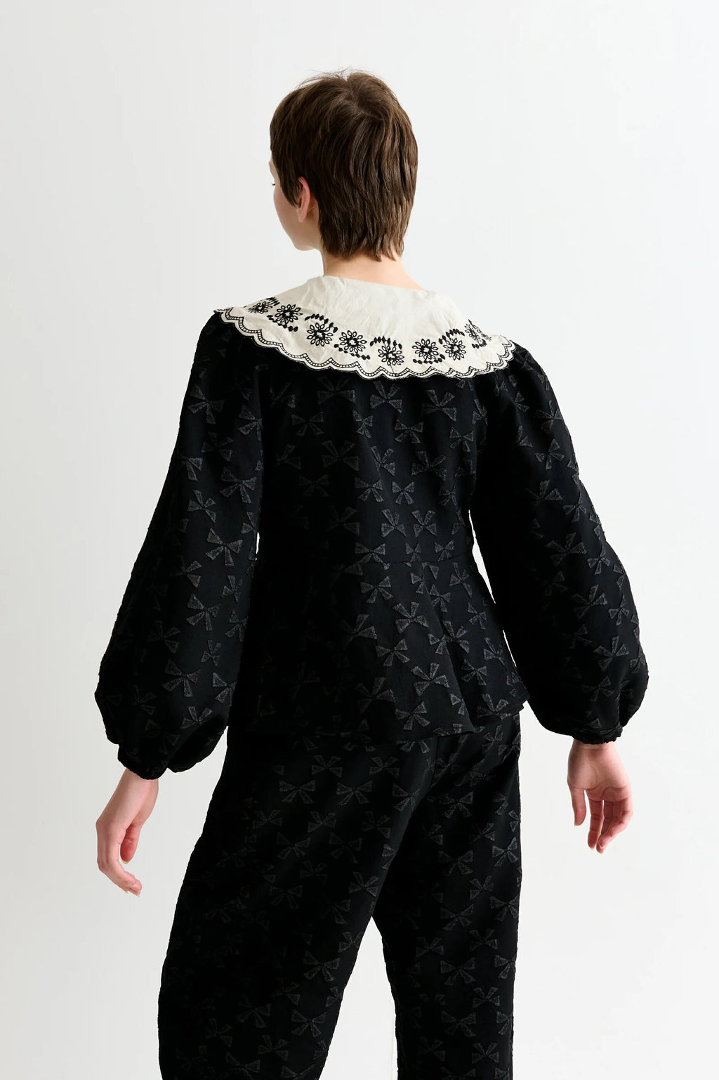Crafted from textured all-over bow jacquard fabric, the Clementine blouse is a sophisticated statement piece. It features a striking off-white embroidered collar, expertly tailored wide sleeves, and a sculptural peplum hemline that adds dimension and elegance. Designed to elevate any wardrobe.