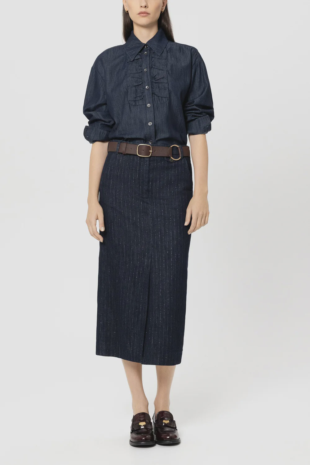 Denim Shirt Blouse with Ruffle
