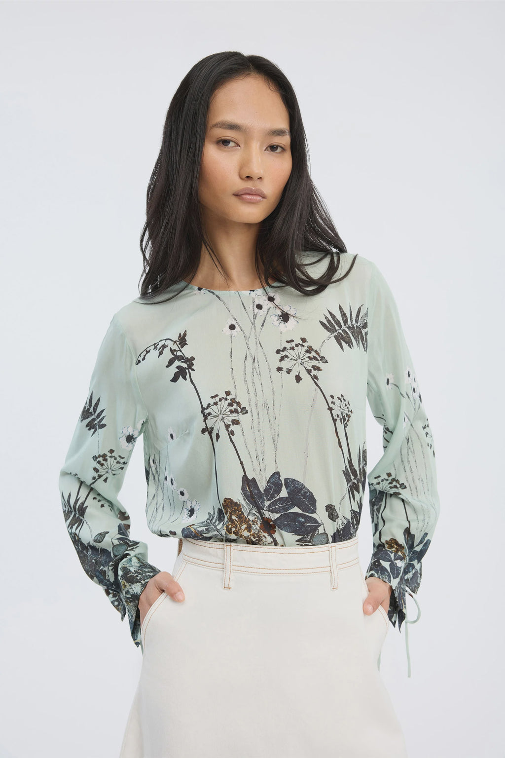 Top with a multicolored botanical print and long sleeves with small tie details at the wrists. It has a round neckline with a drawstring and a straight, relaxed silhouette.
