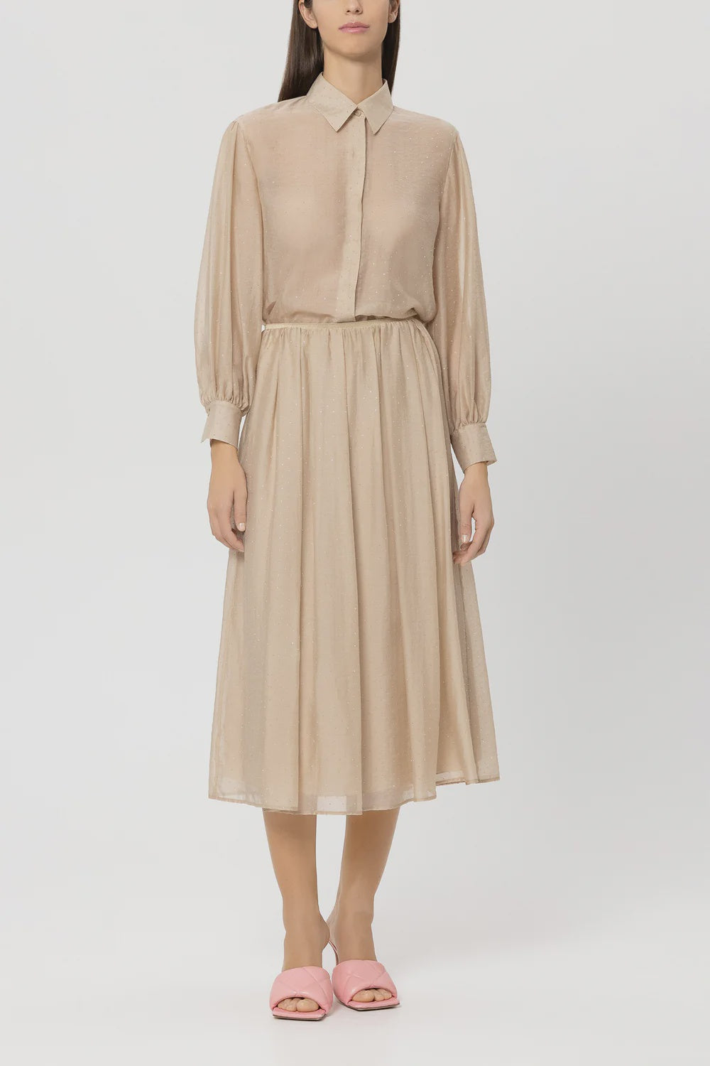 Delicately transparent blouse made from a lyocell blend with elegant shimmering glittering stone trim and a concealed button placket. A pleat at the back and the side slit hem ensure a casual fit.