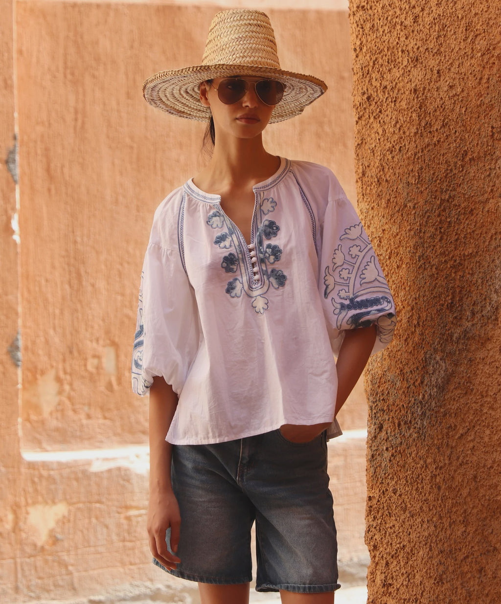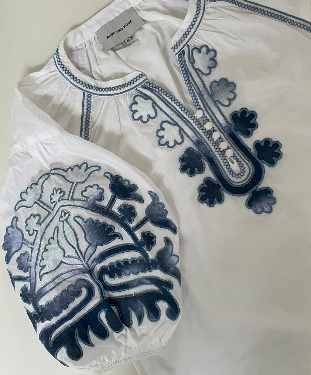This iconic Rose and Rose style is reimagined with distressed denim appliqué motifs and decorative stitching in soft denim blue. Cut from crisp white cotton poplin, it features elasticated blouson three-quarter sleeves for effortless styling. Functional front buttons allow it to slip easily over the head, making it as practical as it is distinctive.
