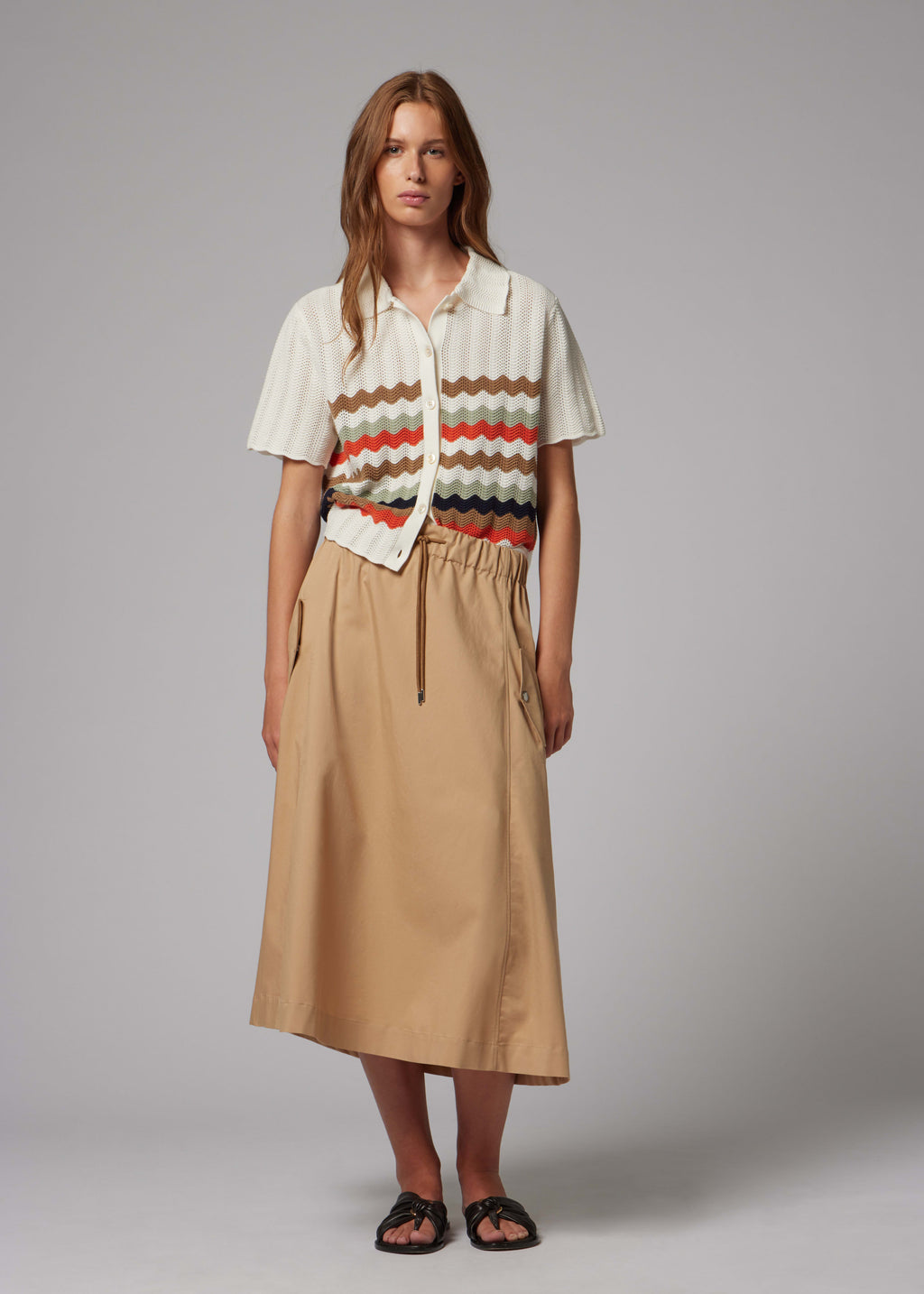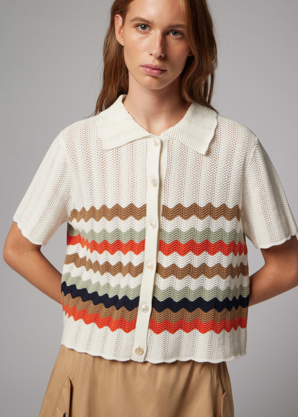 Made from 100% soft cotton, this knitted button up top features a warm toned, zig zag stripe pattern throughout. Complete with an open knit detailing, this top is perfect for smart-casual styling, and can be dressed down with jeans, or dressed up with the addition of tailoring.