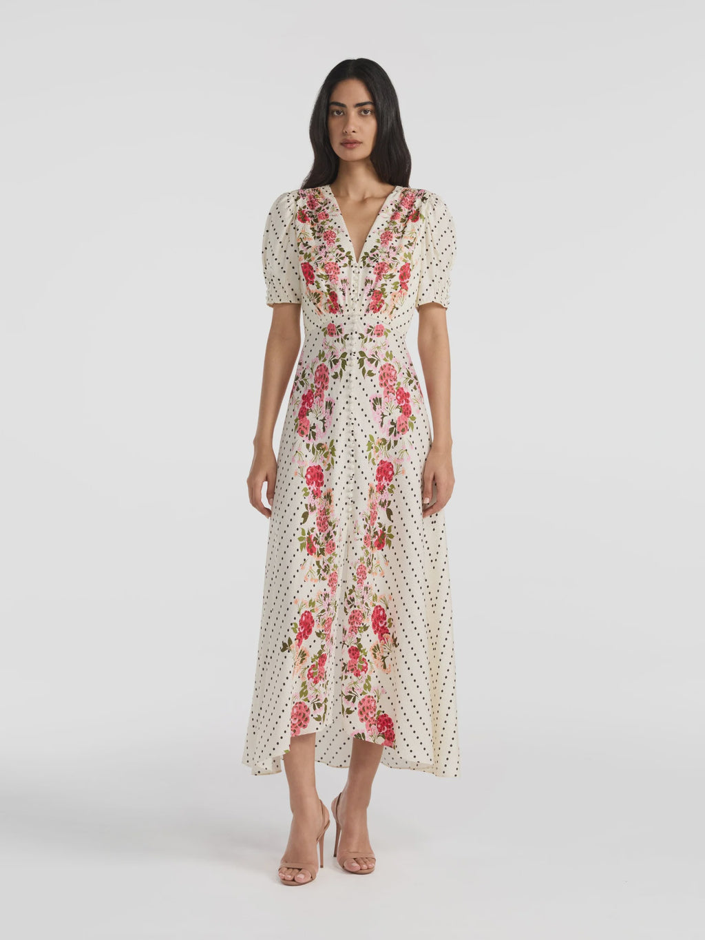 The Lea Long Dress is a signature SALONI SHAPE beloved by customers across continents and generations. Crafted from stamped satin in a meticulously executed bias cut, it drapes beautifully and flatters the figure. The graceful silhouette is accented by a sophisticated print placement featuring classic polka dots framed by a soft rose-toned floral border. It can be effortlessly styled with heels or flats, the perfect go-to dress for any occasion.