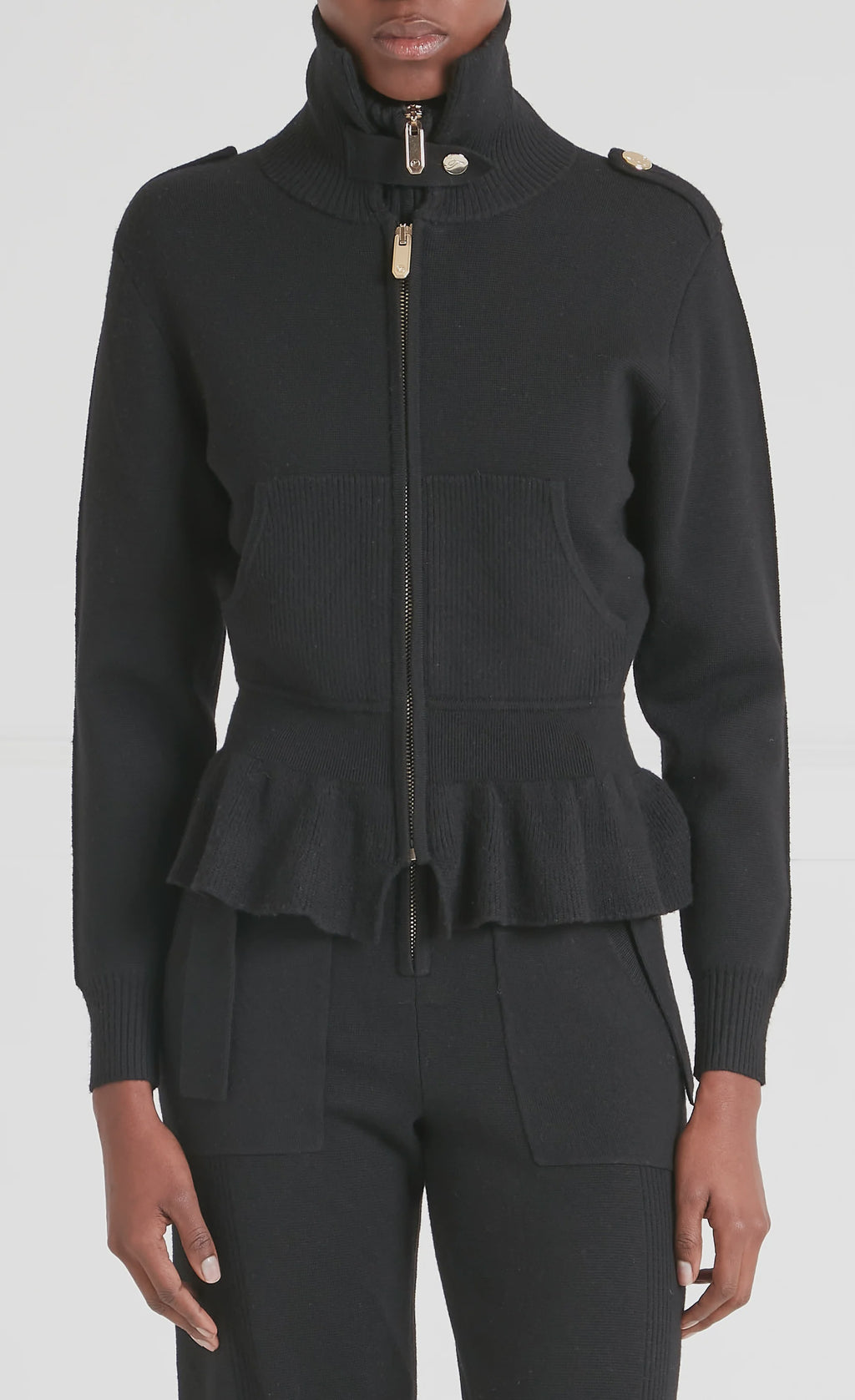 A refined take on utilitarian style, the Napoleon Jacket blends structured tailoring with knitwear. The fitted waist and peplum hem create a flattering silhouette, while military-inspired touches such as epaulettes and a high collar add a polished edge. Finished with a sleek zip fastening, it’s a versatile piece that elevates everyday dressing.