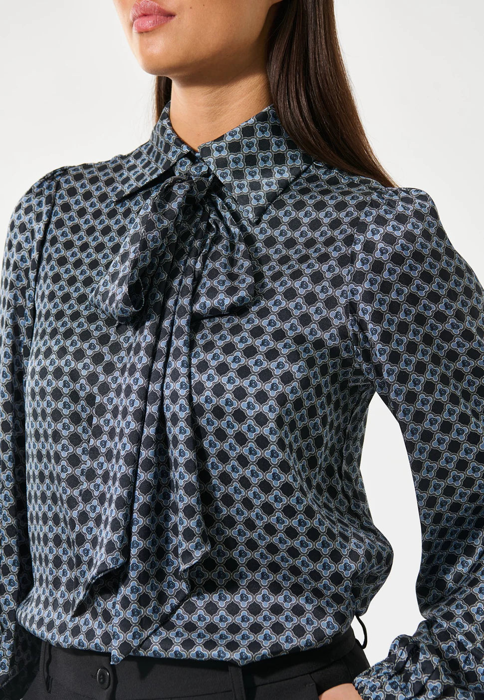 A DEA KUDIBAL classic, this elegant blouse in a small graphic printed silk makes a chic statement with the detachable bow at the neck. It has a regular fit with elasticated cuffs that create a small frill and there are covered buttons at the neck above a key hole slit at the front.