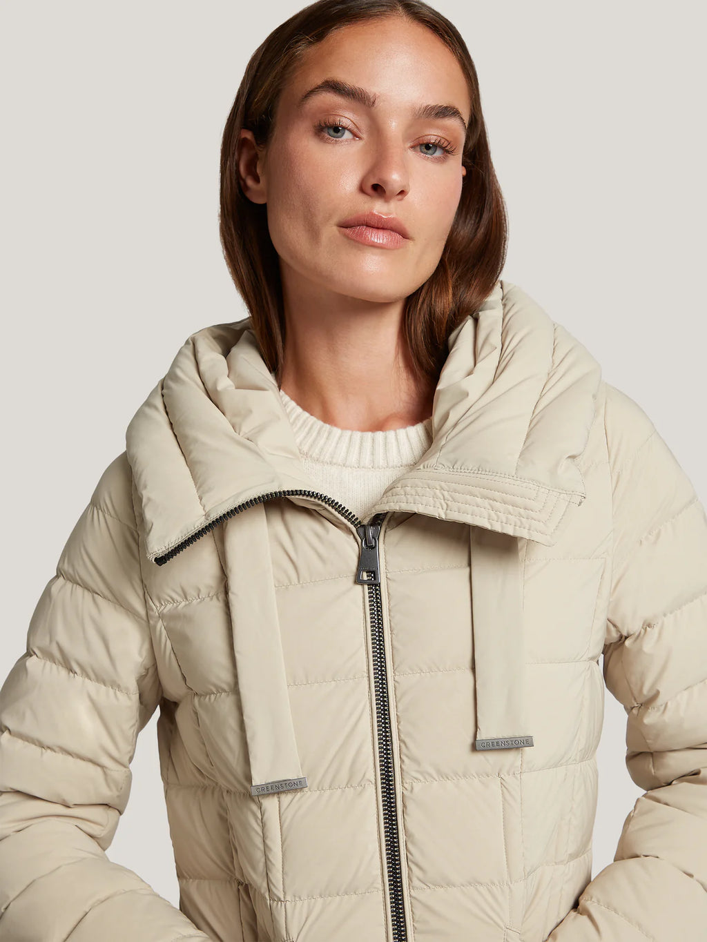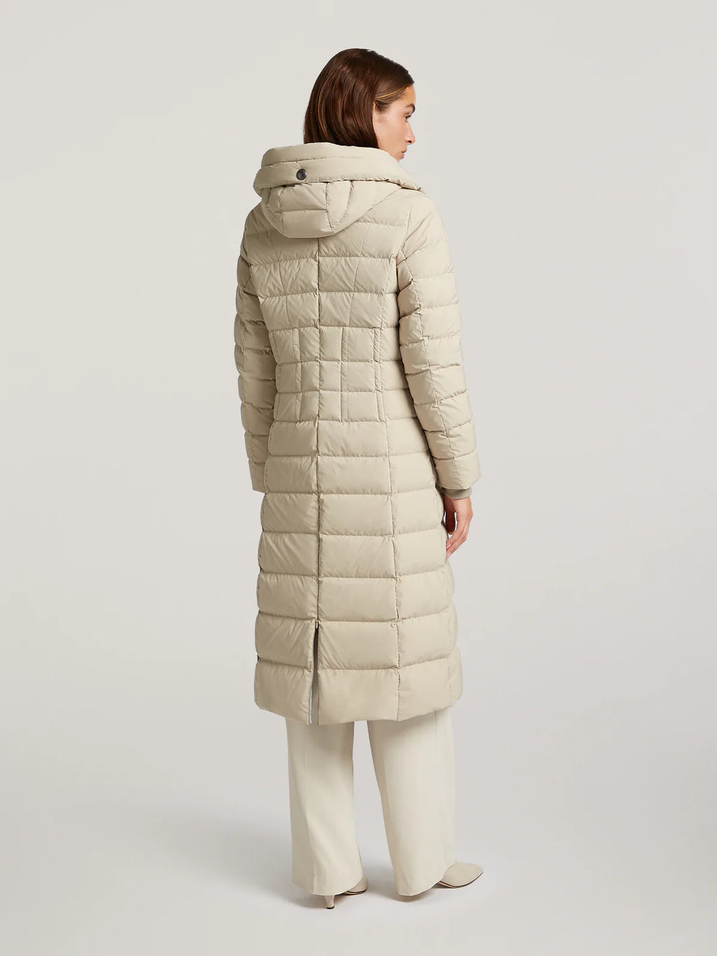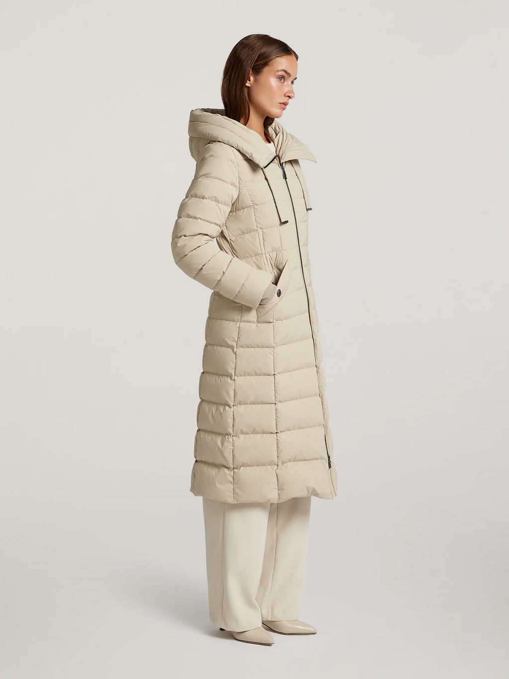 This lightweight stretch down coat offers the perfect blend of style, comfort, and warmth. Filled with responsible down, it features a shaped waist and flared hem that enhance the feminine silhouette. The statement hood adding both elegance and practicality. A hidden zip at the back slit adds ease and a touch of contemporary detail.