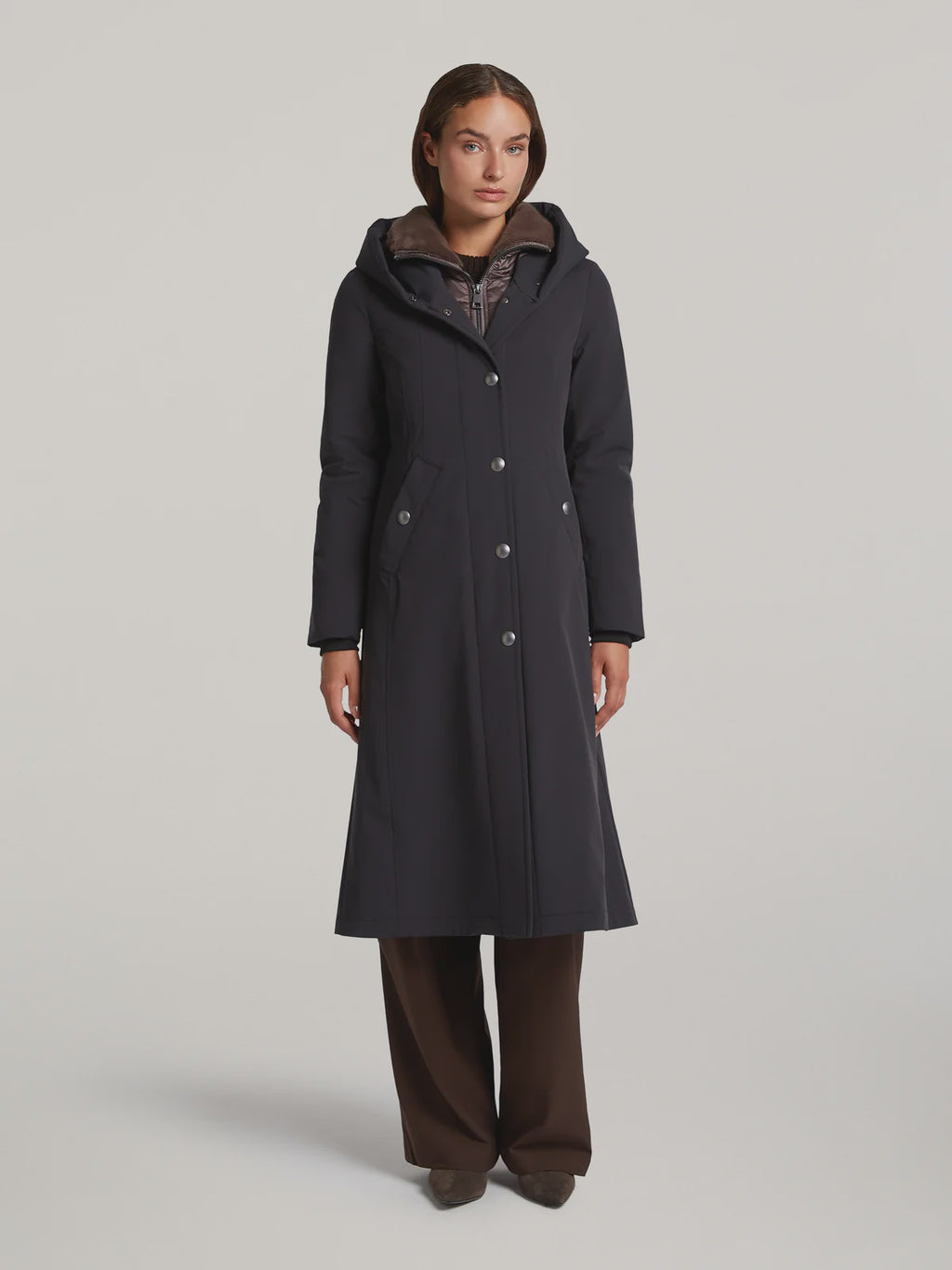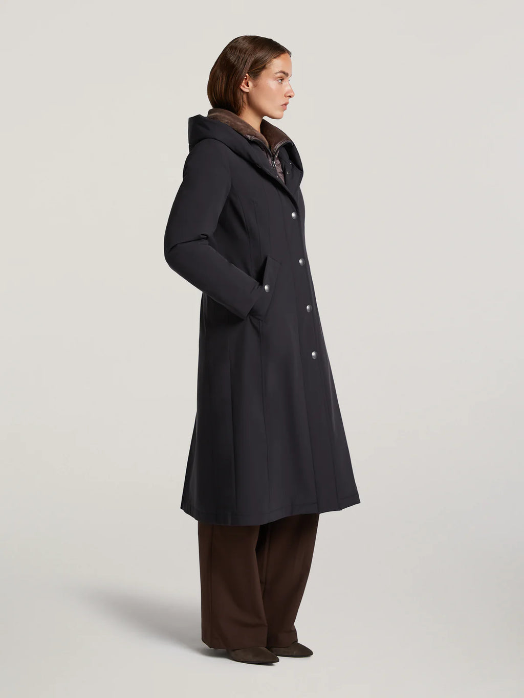 This elegantly shaped technical trench is a true Creenstone icon, where feminine design meets smart functionality. Featuring a shawl collar hood and detachable quilted inner panels with a soft faux fur collar, it adapts effortlessly to changing seasons. An elegant back pleat adds movement and refinement to the silhouette. Luxurious, versatile, and weather-ready, this is rainwear at its finest.