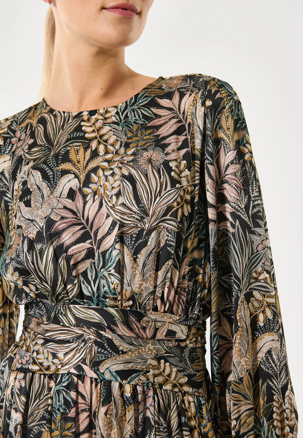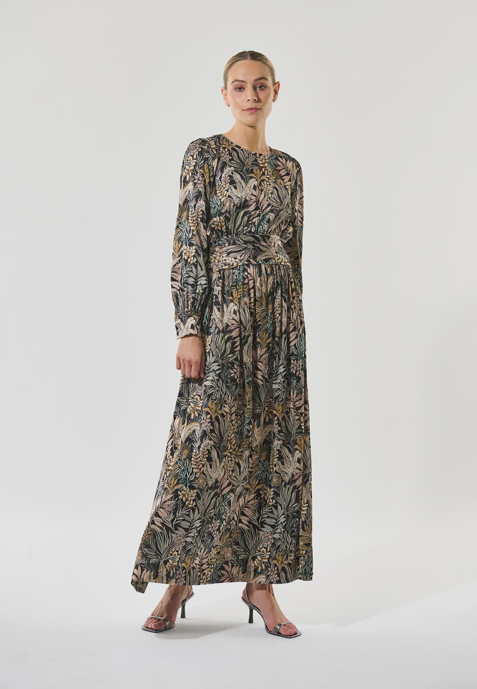 Round necked and easy fit, this ankle-length dress in floral printed silk has a skirt that gathers into a waist band with an attached belt which can be fastened at the front or back. There is a key hole back with button fastening and an invisible zip at the side.