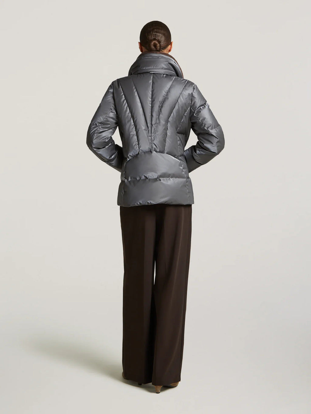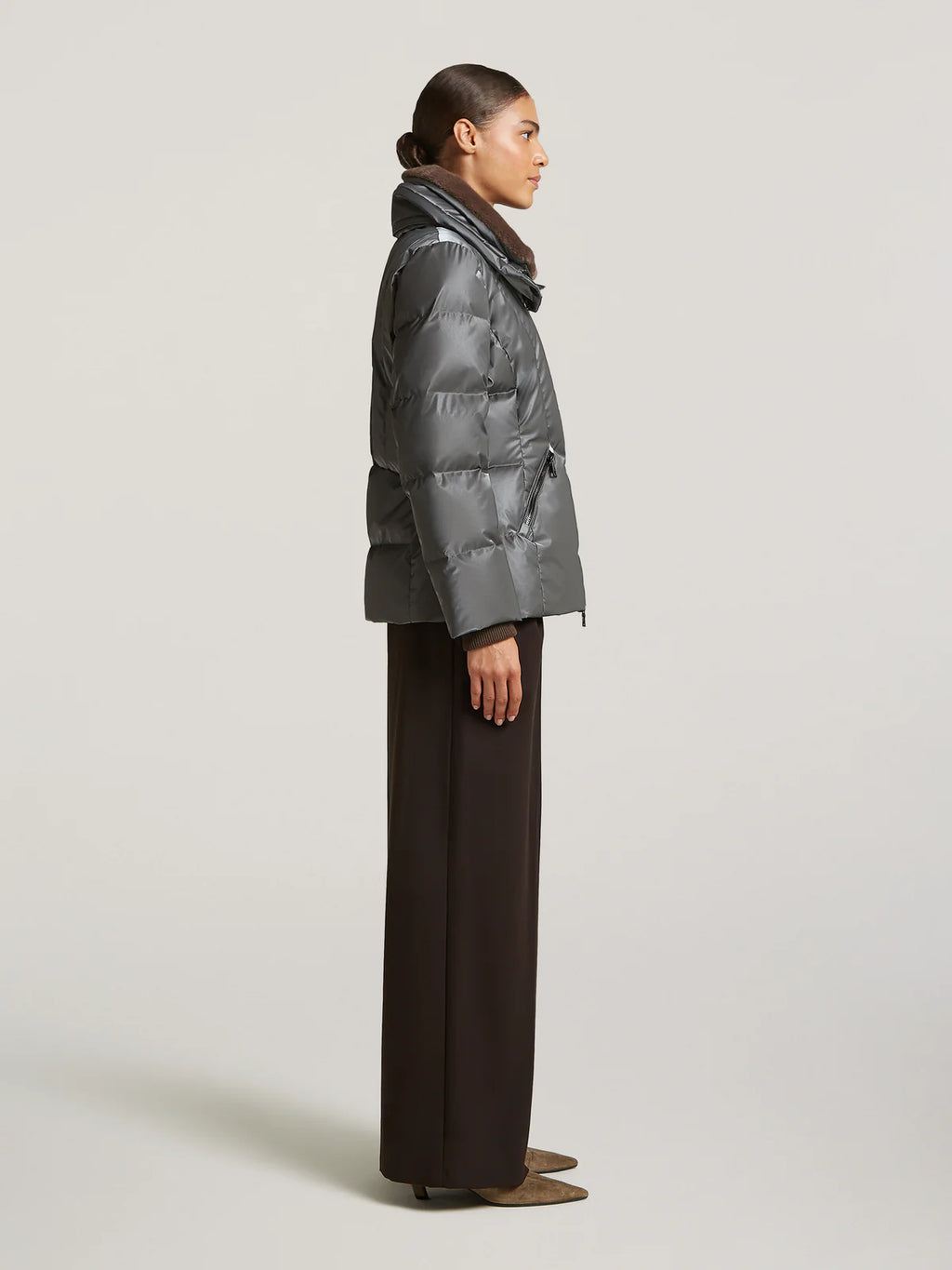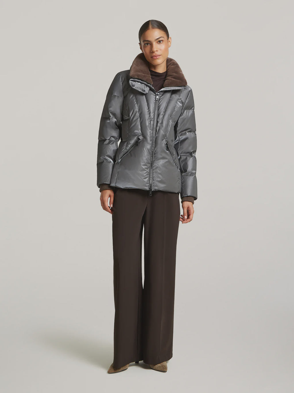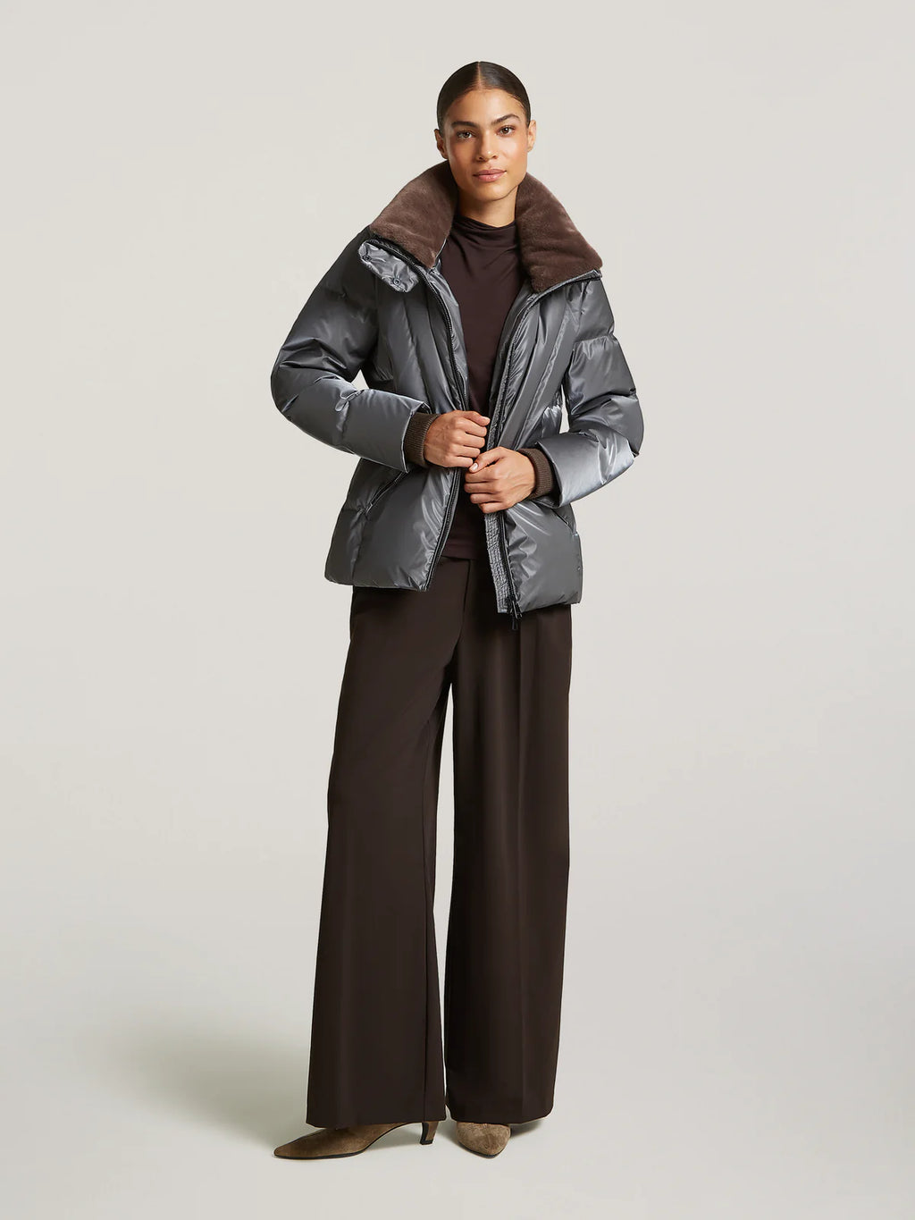 This pearl leather-look jacket blends refined elegance with a modern, edgy touch. It’s elegant quilted with responsible down, providing warmth without adding bulk. The hood hidden in the collar and detachable faux fur inside collar let you customize your look to suit any mood. Long knitted cuffs add comfort and a clean, stylish finish.