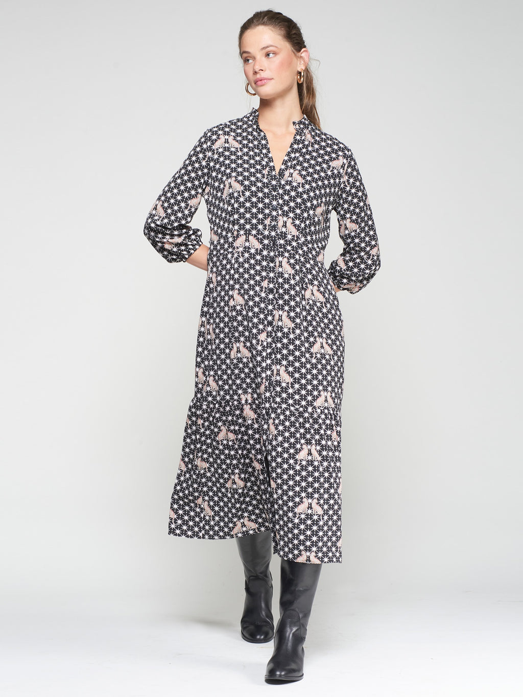 Long black dress with white star pattern and leopard figures. V-neckline with a stand-up collar, front button closure, and long sleeves. Flared tiered skirt.
